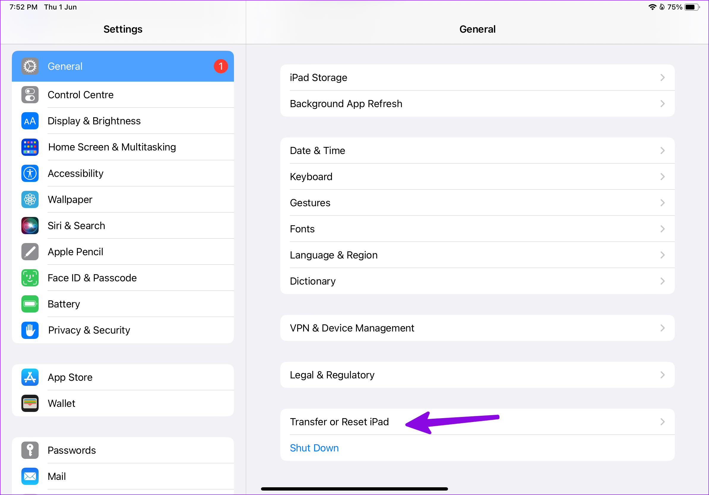 Step 1: Open the Settings app > tap on General > Transfer or Reset iPad.