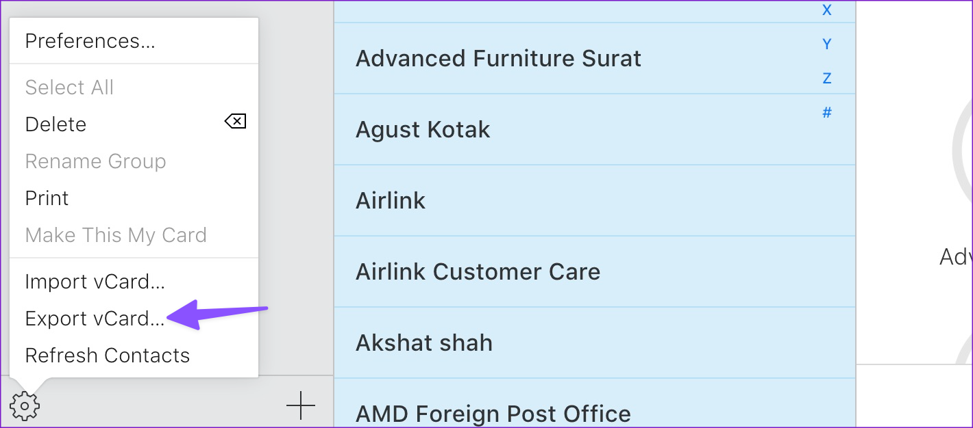 Step 4: Select Export vCard from the context menu that pops open. The browser will download a .VCF file with your iCloud contacts.