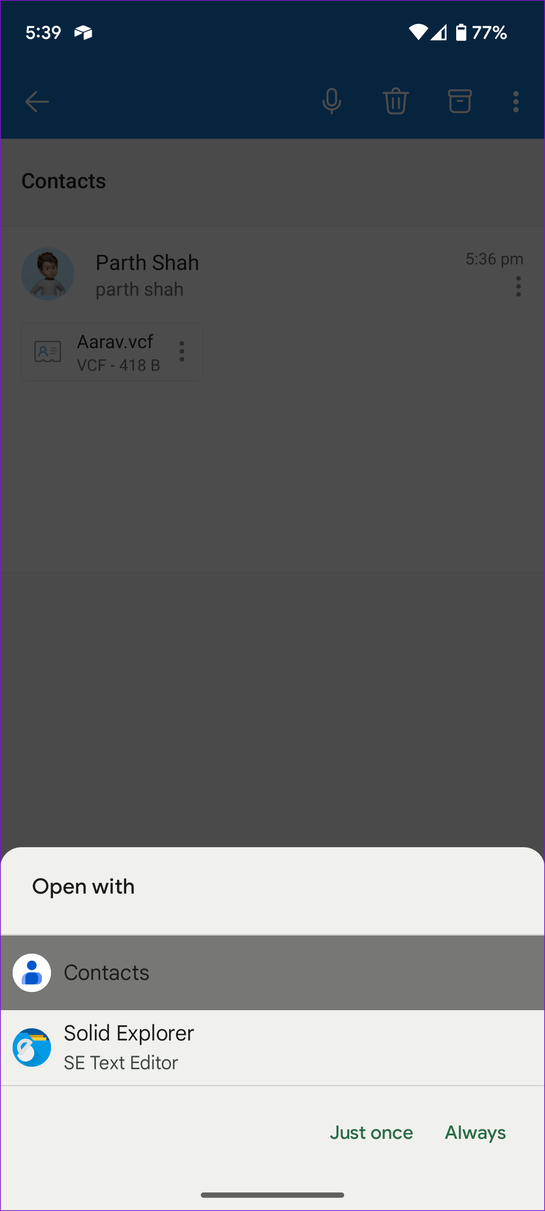 Step 5: Open the received file with the Contacts app and select your Gmail account to save imported contacts.