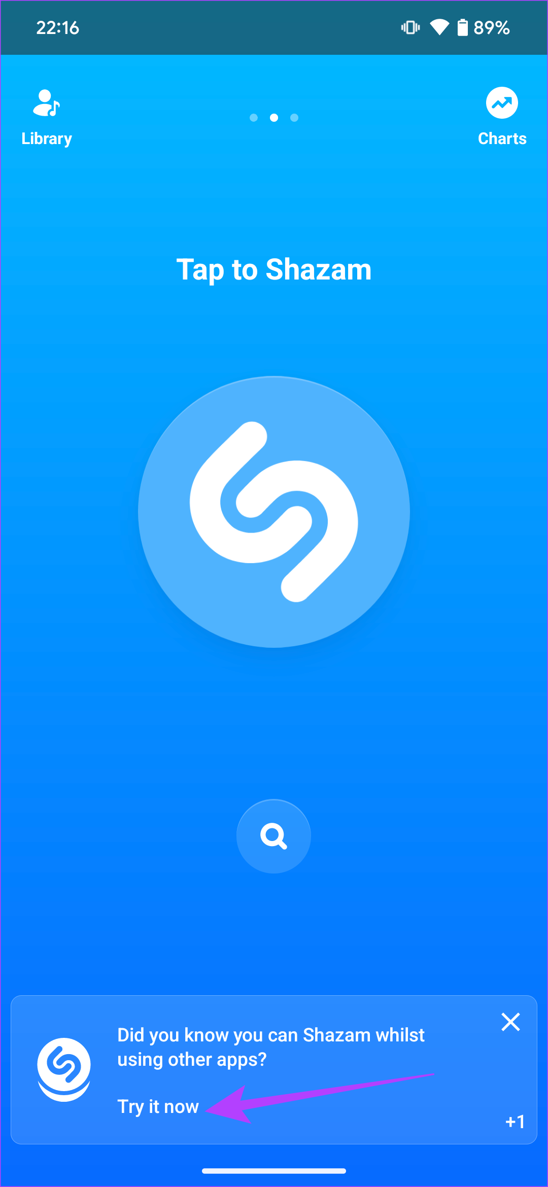 Step 1: Install the Shazam app from the Google Play Store. Open the app and you should see a banner at the bottom saying you can use Shazam whilst using other apps. Tap on Try it now.